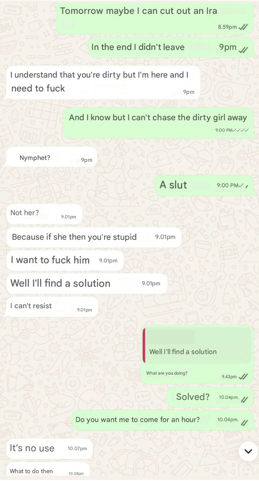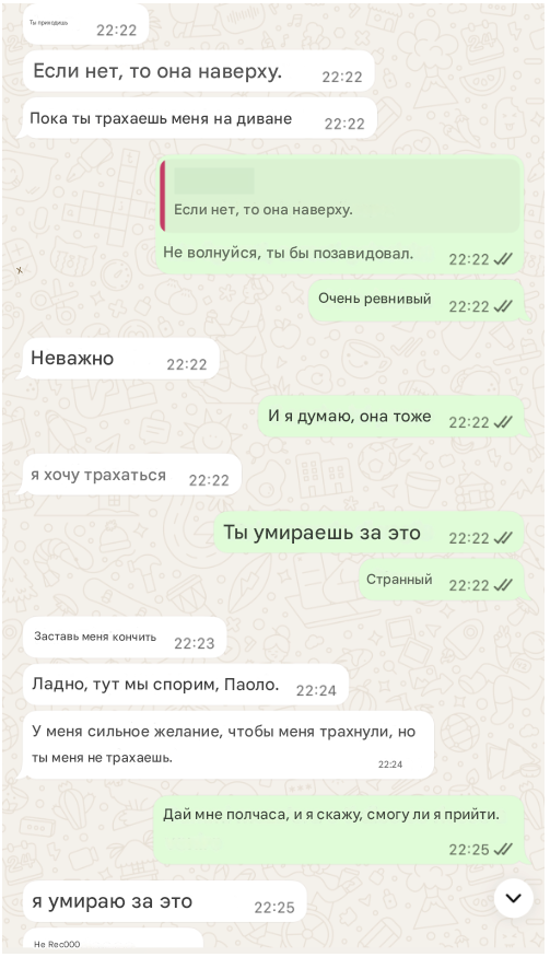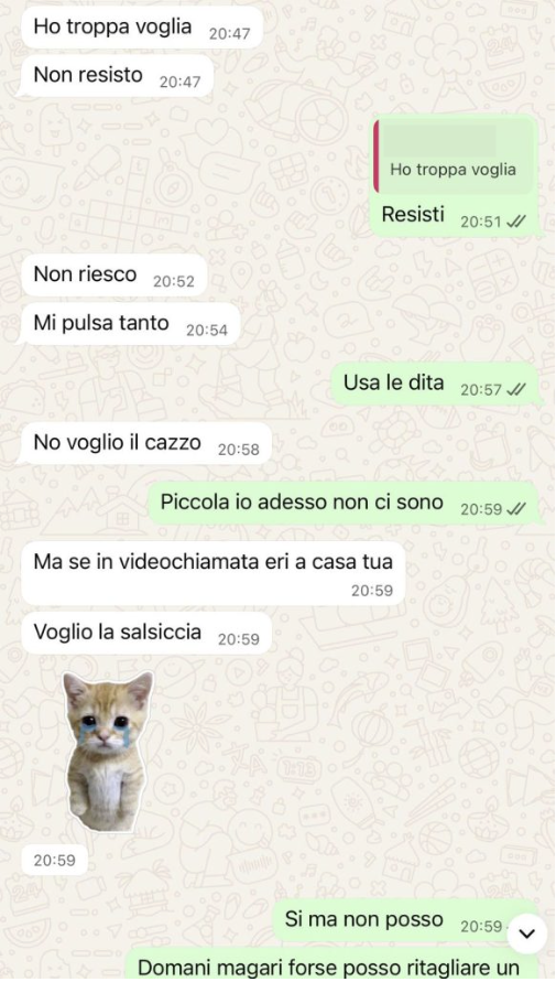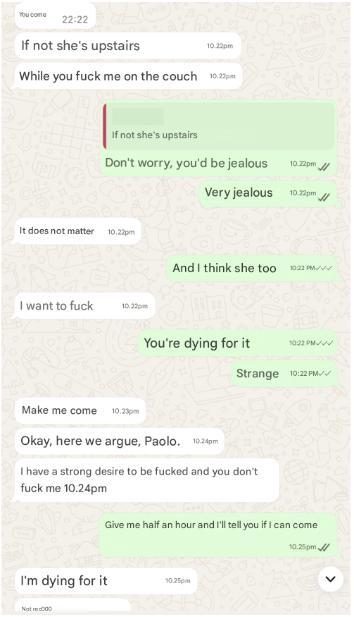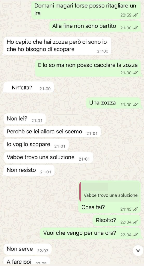 This is Ninfetta’s week. I notify PiccoLina that I won’t be available this week. She tries to figure out if I’ll spend it with her bitter rival (whom she doesn’t hesitate to call “slut“, “escort“, “fish with inflatable lips“, etc.) or with others. I’ve been very clear: it shouldn’t matter to her who I’m with; it’s my choice. So I don’t disclose. I tell her I have to leave and go out of Milan, when instead I’ll spend all the time at home having sex with Ninfetta. But she’s not stupid.