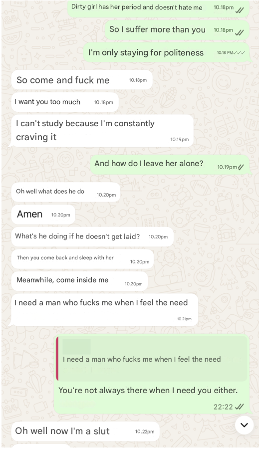 Me: “Ninfetta, you’re not present, you don’t fuck me, you’re not affectionate, you’re elsewhere in your mind… there’s no point in dedicating time to you”